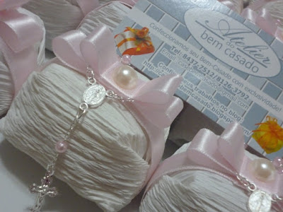 | Bem-Cegonhas recheados por doce de leite e embalados em tecido floral, fita de cetim e 1/2 pérola |